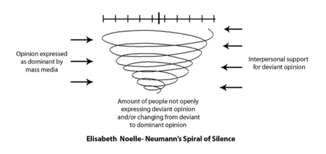 Amire Róna hivatkozott: Elisabeth Noelle-Neumann politológusnak, a mai napig aktív, CDU-közeli Allensbach közvéleménykutató intézet társalapítójának 70-es évekbeli elmélete. Noelle-Neumann a média és a közvélemény viszonyát próbálta megragadni: hogyan hat a média az emberek nyilvánosan kifejtett vélekedéseire és fordítva. A hallgatás spiráljának az elmélete azt írja le, hogy a közvélemény hatalma abban áll az egyén felett, hogy az emberek félnek az izolációtól: nyilvános megszólalásaikban amiatt igazodnak, mert nem akarnak kitaszítva lenni. Noelle-Neumann az empirikus kutatás számára úgy operacionalizálta a közvélemény fogalmát, hogy az a vélemény és viselkedésmód értéktelített területeken, amit nyilvánosan ki lehet fejezni, ami nyilvános helyeslésre talál, ami nem rejti azt a veszélyt, hogy ezért kitaszítják az embert. Ma talán uralkodó diskurzusnak, korszellemnek és hasonlóknak hívjuk.