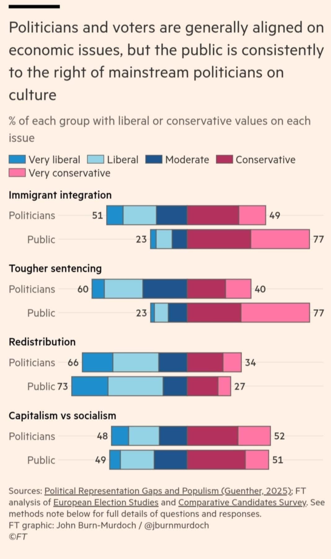 „A politikusok és a választók általában egyetértenek a gazdasági kérdésekben, de a közvélemény következetesen a mainstream politikusoktól jobbra áll a kultúra terén.”