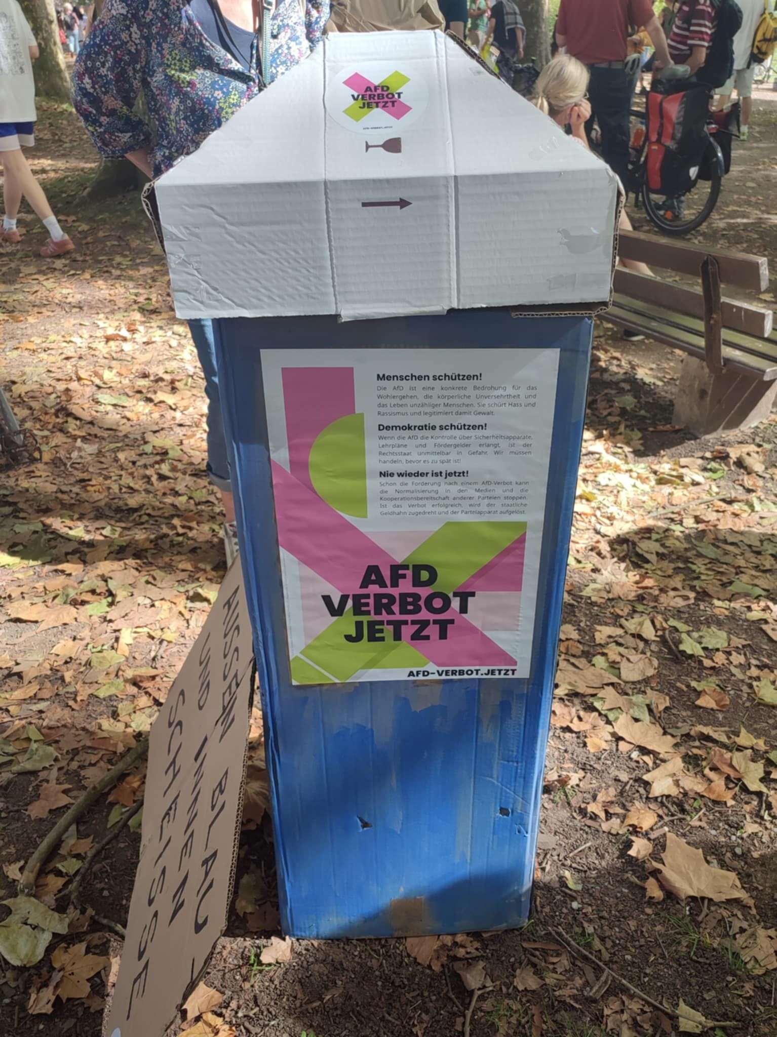 A „Soha többet [Holocaust]” most van! Az AfD betiltásának puszta követelése is megállíthatja a párt normalizálását a médiában és a többi párt együttműködési hajlandóságát. Ha a betiltás sikeres, az állami finanszírozás csapja elzáródik és a pártapparátus feloszlik.